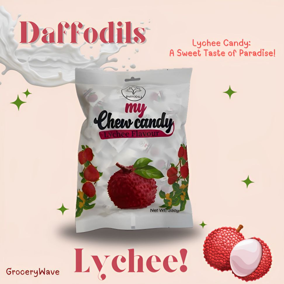 Daffodils My Chew Candy Lychee 350gm offers a delightful lychee flavor in a convenient 350-gram pack. This chewy candy provides a satisfying texture and a sweet, fruity taste that appeals to lychee lovers. Ideal for sharing or enjoying as a treat, it combines quality ingredients to deliver consistent flavor and freshness. Perfect for those seeking a flavorful candy experience with a tropical twist.