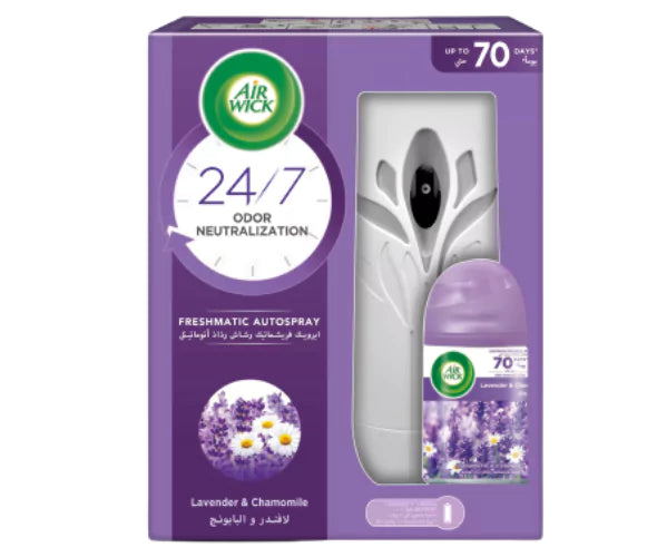 The Freshmatic Auto Spray Kit Lavender and Camomile 250ml is an automatic air freshener designed to provide a consistent fragrance to your home. It comes with a 250ml refill can of Lavender and Camomile scent, which offers a calming, soothing fragrance blend of lavender and chamomile. The automatic spray dispenser releases bursts of fragrance at set intervals, keeping your space smelling fresh and pleasant without the need for manual spraying.