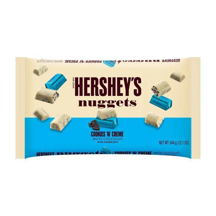 Hershey's Nuggets Cookies 'n' Cream are delicious bite-sized chocolates that combine the classic Hershey's milk chocolate with a crunchy cookie center, all wrapped in a creamy white chocolate coating. These individually wrapped nuggets are perfect for snacking, sharing, or gifting.