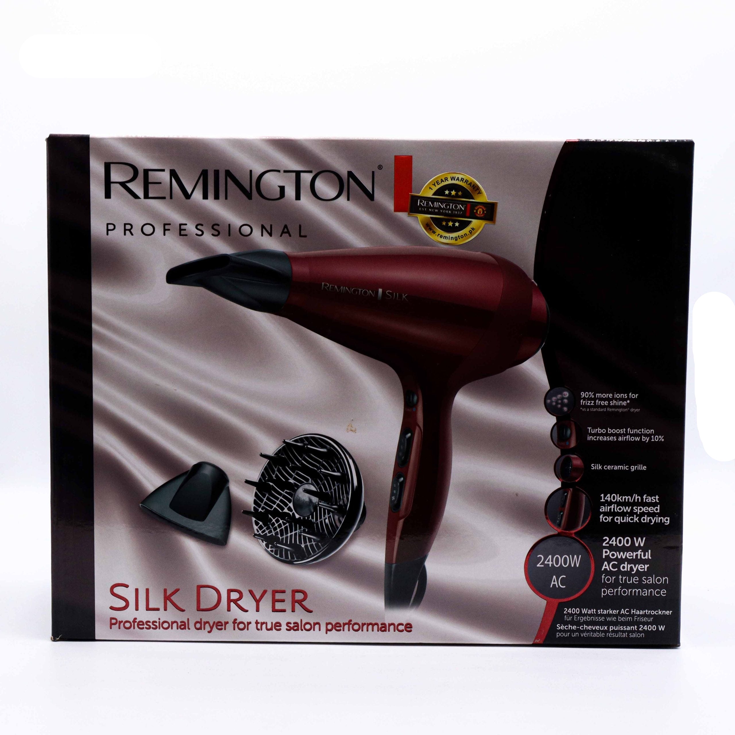 The Remington Hair Dryer AC9096 delivers professional-grade drying performance with advanced ionic technology that reduces frizz and enhances shine. Featuring multiple heat and speed settings, this lightweight dryer accommodates various hair types and styling preferences. The concentrator nozzle attachment enables precise airflow for controlled styling, while the cool shot button sets your style effectively. Built with durability in mind, the AC9096 combines reliable engineering with user-friendly operation, making it an excellent choice for daily hair care routines.