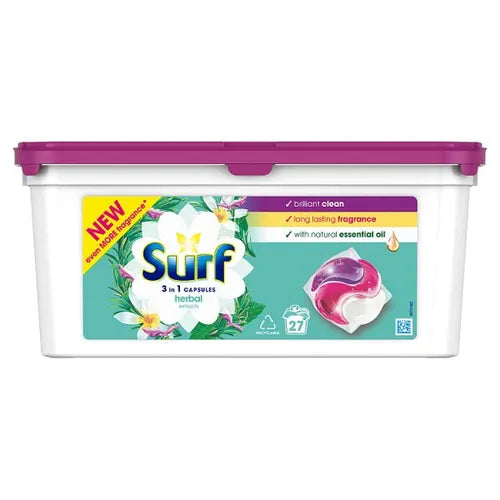Surf Herbal Extracts 3 in 1 Washing Capsules feature even more of the scent-sation of herbal extracts, with sophisticated scents of velvety peach, refreshing jasmine and clean violet. You can rest assured that your clothes will be brilliantly clean and fresh for longer with these laundry capsules from the UK's no.1 fragrance detergent brand**. Surf Herbal Extracts laundry detergent and its sensational fragrance is available in washing liquid, washing powder, and washing capsules. Its unique formula, featuring essential oil, cares for the fabric in your clothes. Surf's laundry range offers brilliant cleaning while bringing you the joy of fresh fragrance long after you've washed your clothes.