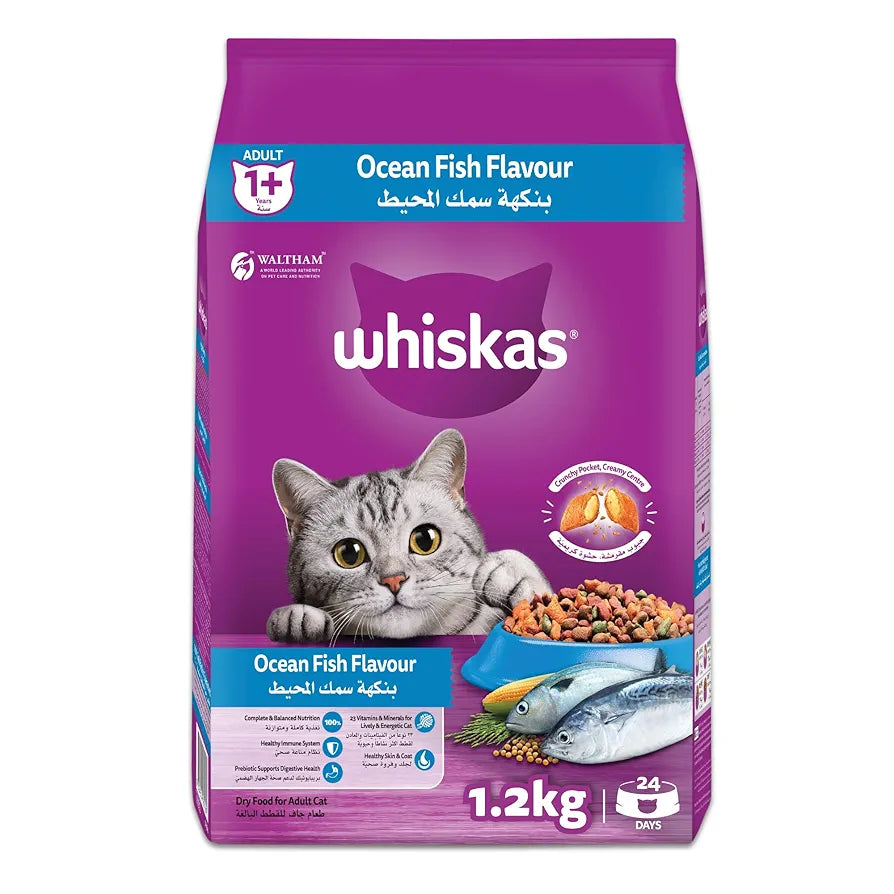 Whiskas Bag Ocean Fish 1+ 1.2kg offers a balanced diet specially formulated for adult cats aged one year and above. Enriched with ocean fish flavors, it provides essential nutrients and high-quality protein to support healthy muscles and a shiny coat. This carefully crafted formula promotes overall well-being and vitality, making it an excellent choice for maintaining your cat’s health.